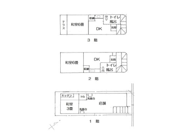 1階は元美容院、2階3階は単身用の住居1戸ずつあります。